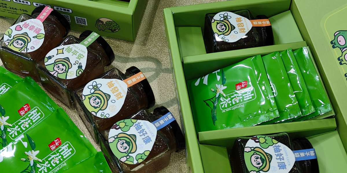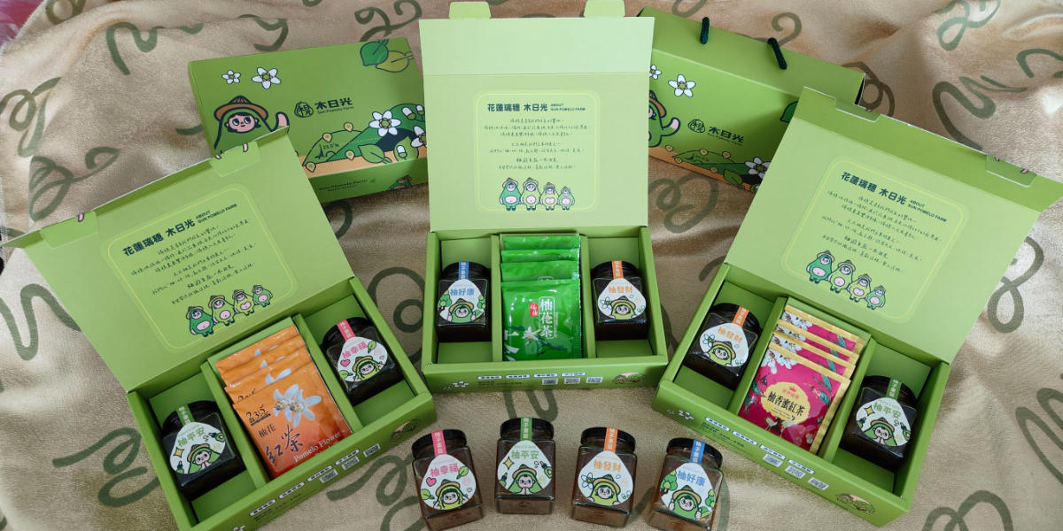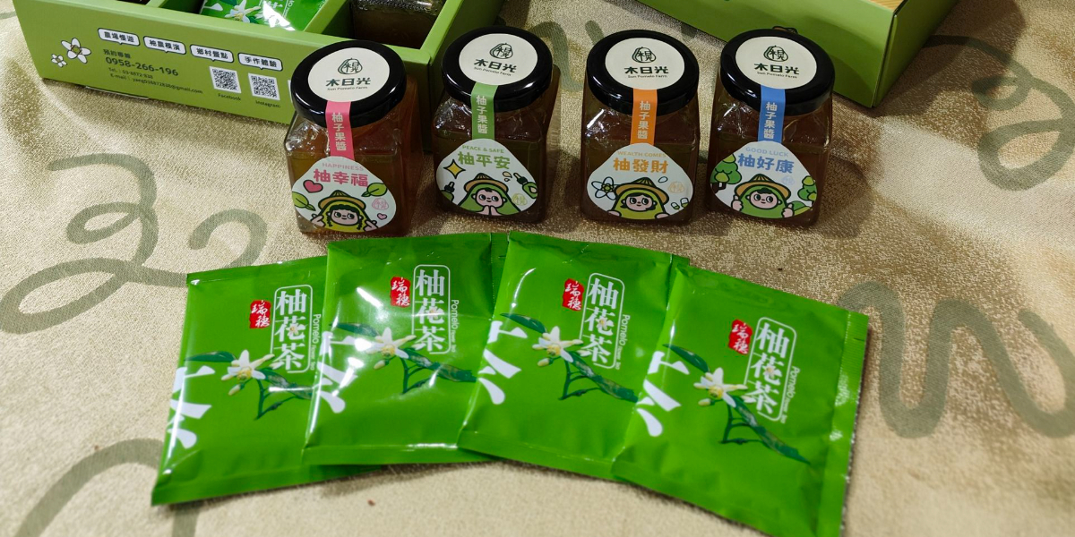 本公司位於花蓮縣瑞穗鄉,以鶴岡文旦為主題,推廣一年四季的體驗活動,開發本禮盒的構想,係希望透過柚子的花和果實的結合,提供一組客製化的柚香禮盒。其中果醬提供不同貼標,共有好康、發財、幸福、平安等四種標籤可供選擇,再搭配不同的發酵的茶種,讓送禮者可依不同對象給予不同祝福,並可搭配。
